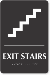 Exit signs present a unique situation under ADA guidelines. The tactile sign mounted at the exit door requires raised characters and Braille. However, the illuminated overhead exit sign visible from across a room only follows visual requirements because it’s designed for distance viewing, not touch reading.